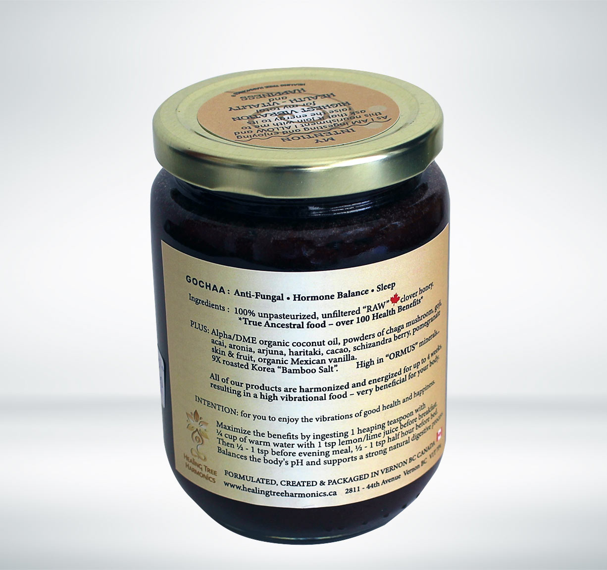 PLUS: Alpha/DME organic coconut oil, powders of chaga mushroom, goji, acai, aronia, arjuna, haritaki, cocoa, schizandra berry, pomegranate skin & fruit, organic Mexican vanilla.