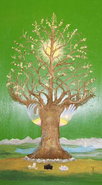 Behind this painting is one the Healing Tree Doors. These doors are the epicenter of where the intention of the happiness, health and longevity along with the infusion of earth energies and calibrated sound vibrations is focused into the blending process of each product.